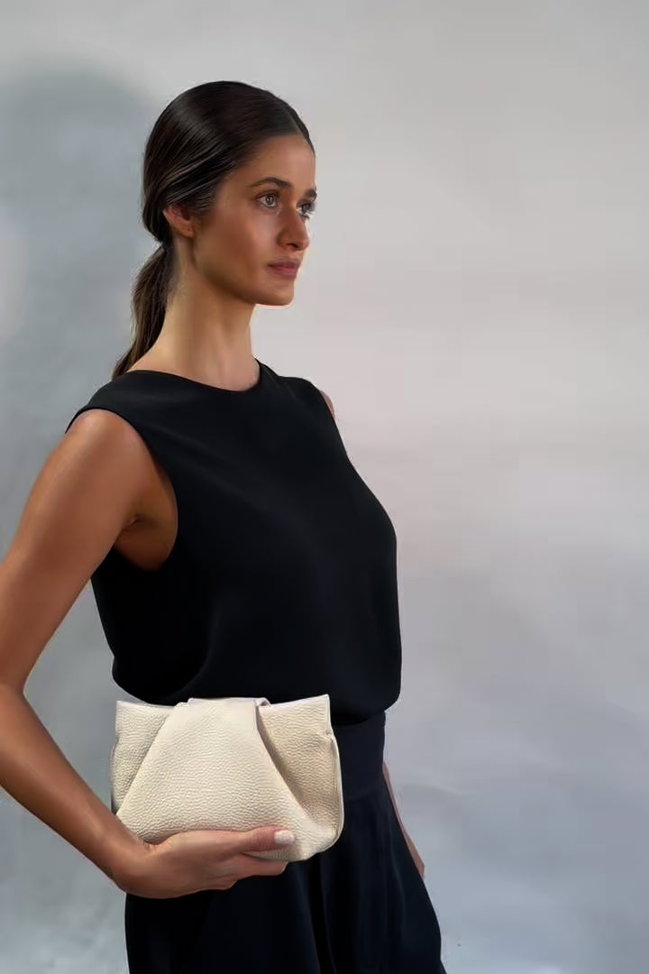 The Fold Mini pattern is inspired by the deep creases seen in discarded leather scraps awaiting re-use, now birthed to a bow-like effect to decorate this architectural like design, expressing craftsmanship in handmade creation. Wear Fold Mini Grain White Wash as a shoulder bag with an interchangeable fine leather strap or handheld as a small clutch. Optional straps can be added for further customization.